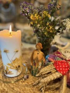Wir haben die Kraft der Schnitterin in unsere Mitte geholt, haben ihrer Weisheit gelauscht, gespürt was in uns zur Ernte bereit und unsere inneren Erntekammern geöffnet, haben dankbar das Brot miteinander geteilt, einen Tee für unser weibliches Sein gemischt und einen Segensraum füreinander und für das große Ganze gewebt.