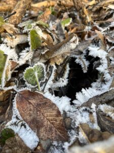Und da stehe ich, die Sonnenstrahlen malten zwischen den nackten Bäumen ein magisches Bild für mich, richtig eisig kalt ist es, der Boden gefroren und die Blätter sind umhüllt von schönsten Eiskristallen.